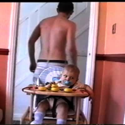 Several women sit at a picnic table for a back yard bachelorette party. One young woman lights a large bottle rocket firework. It flies into the air, bounces off the edge of the roof, falls back down to the ground, and explodes, sending sparks everywhere. The women run away just before it explodes. Subtitle text over the footage.