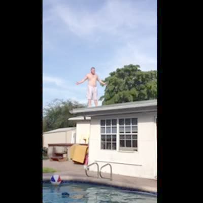 A man attempts to jump off a roof and into a pool. At 0:18, he slips and falls in on his back. DON'T USE THIS CLIP - DANGEROUS AND IMITATABLE